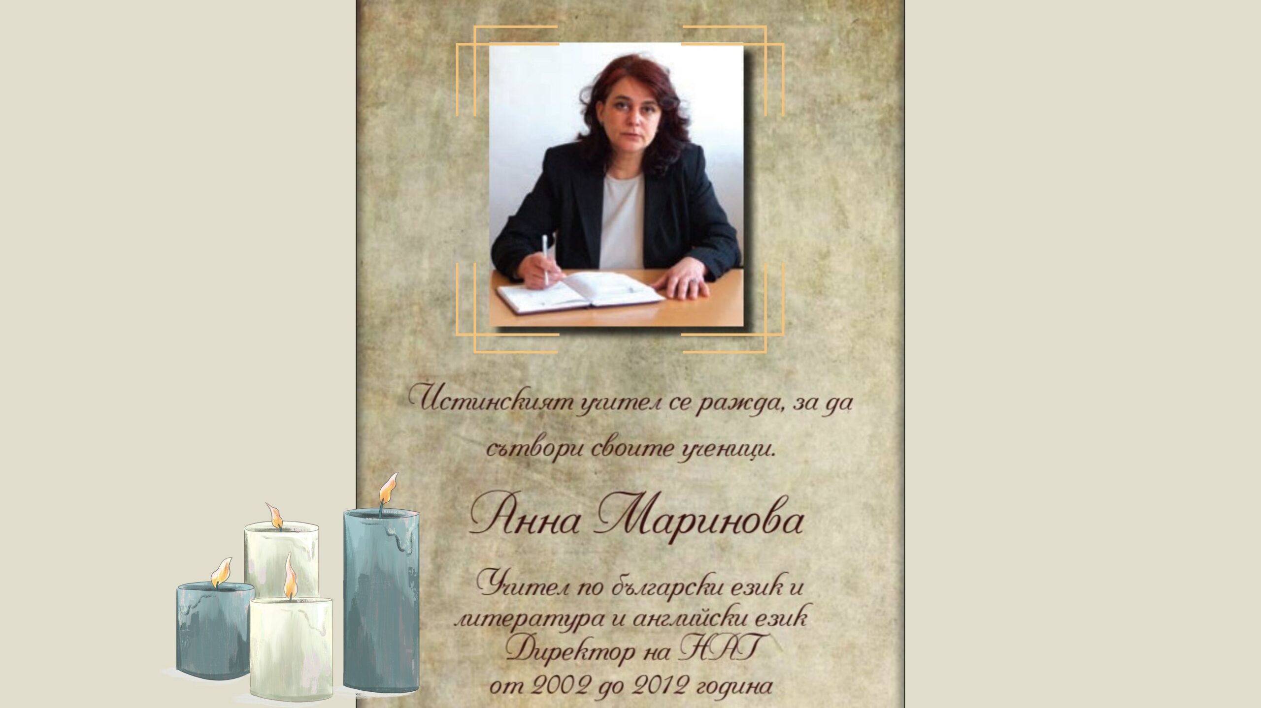 Почина Анна Маринова, дългогодишен директор и преподавател в Национална Априловска гимназия Поклонението ще се състои на 10.03. (вторник) от 12.30 ч. в храм „Свети Йоан Предтеча“ (Камъка), гр. Габрово. Тъжната новина съобщават от Национална Априловска гимназия. Анна Маринова оставя ярка следа в историята на училището и в сърцата на поколения ученици и колеги! Анна Маринова [...]