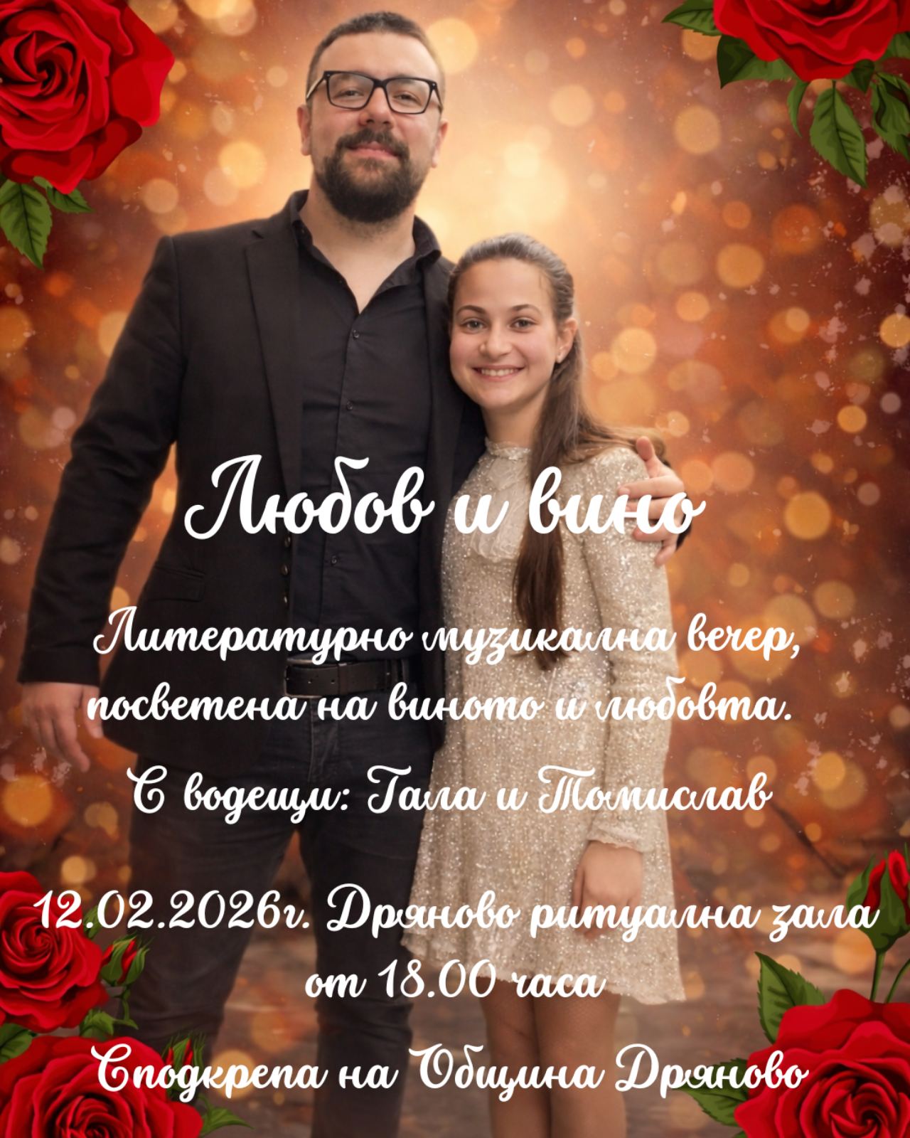 Поезия и музика ще отбележат празника на любовта и виното в Дряново За трета поредна година Томислав Линков и Община Дряново организират поетично-музикална вечер, посветена на празника на любовта и виното – 14 февруари. Събитието носи името „Любов и вино“ и ще се състои на 12 февруари от 18:00 часа в Ритуалната зала на Община [...]