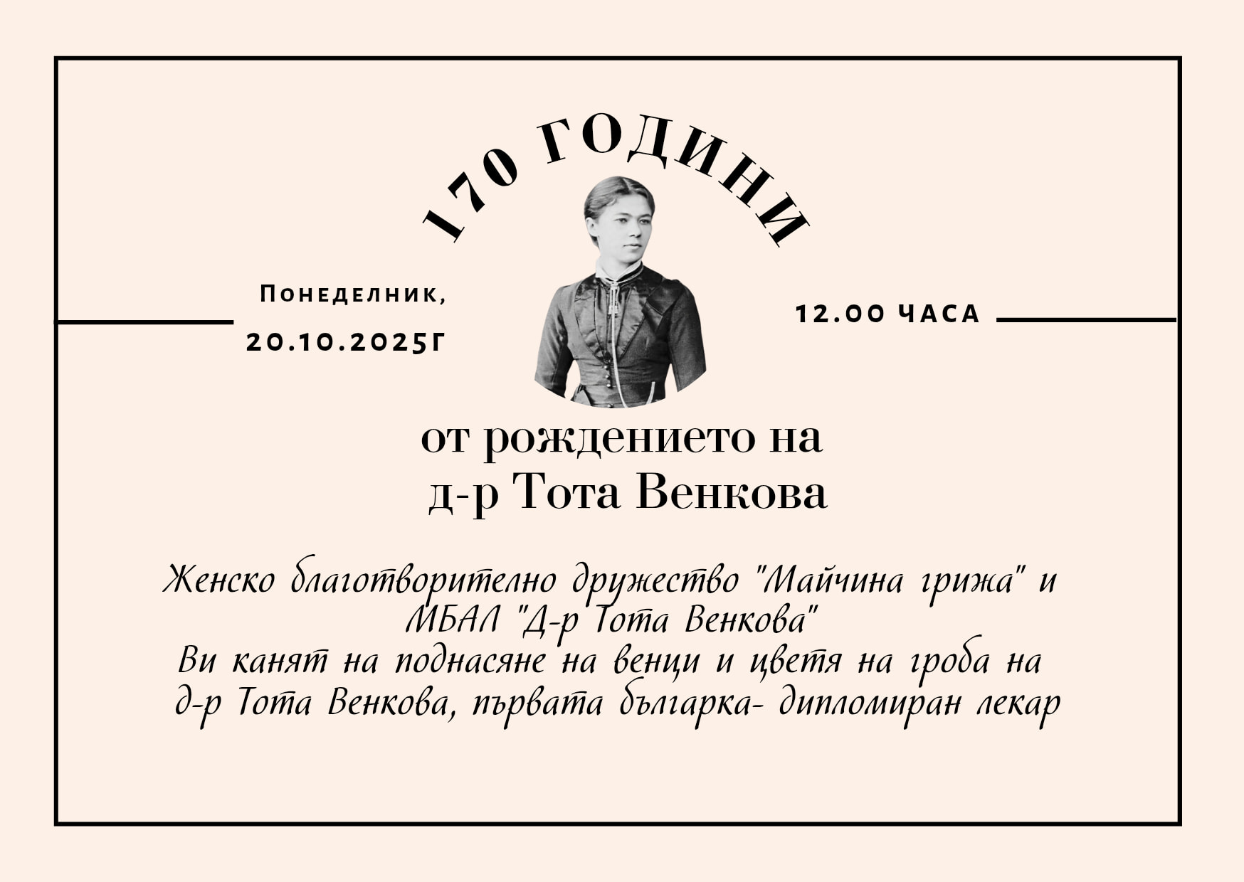 - С поднасяне на цветя и венци Габрово ще отбележи 170 години от рождението на д-р Тота Венкова В понеделник, 20 октомври, се навършват 170 години от рождението на забележителната д-р Тота Венкова. Нейната памет ще бъде отбелязана с тържествено поднасяне на цвета пред гроба ѝ, от 12:00 часа. Организатори на събитието ЖБД „Майчина грижа“ и [...]