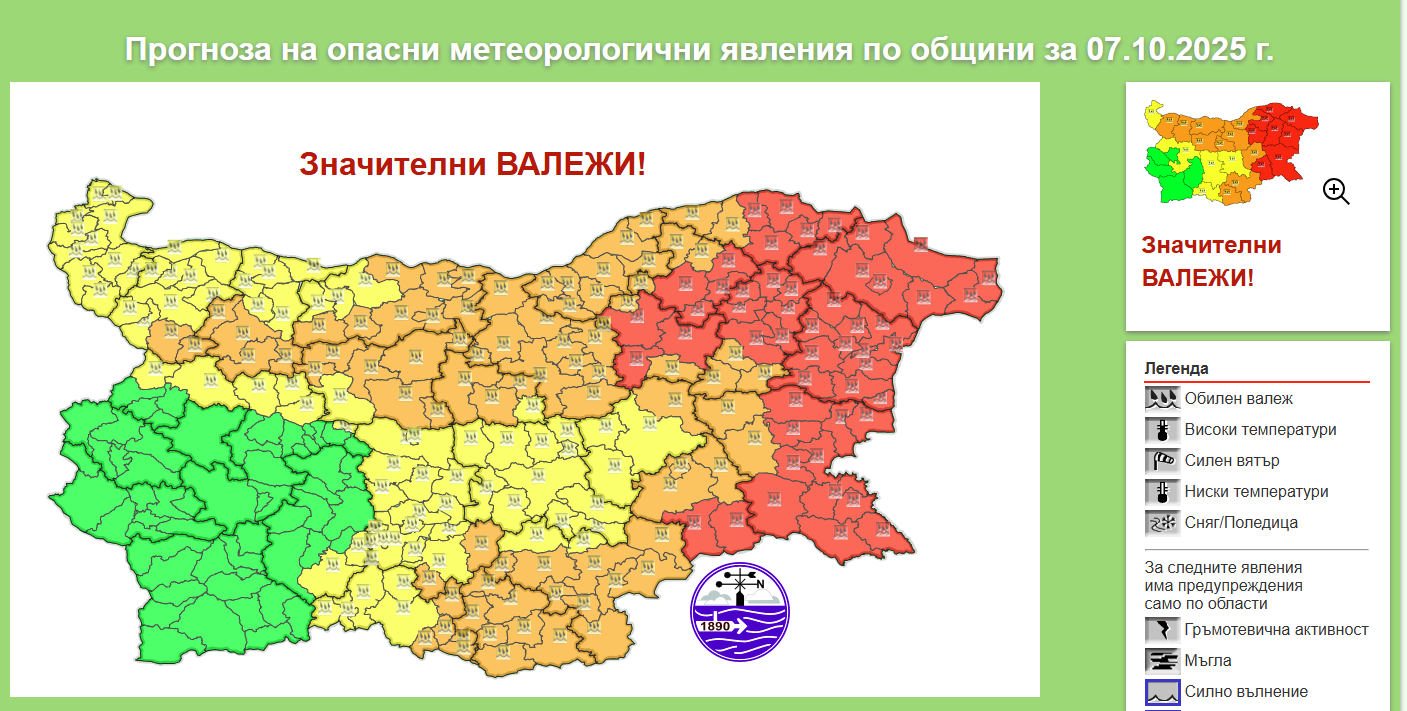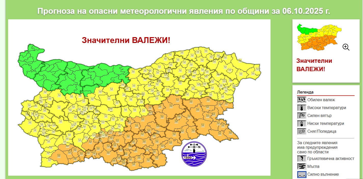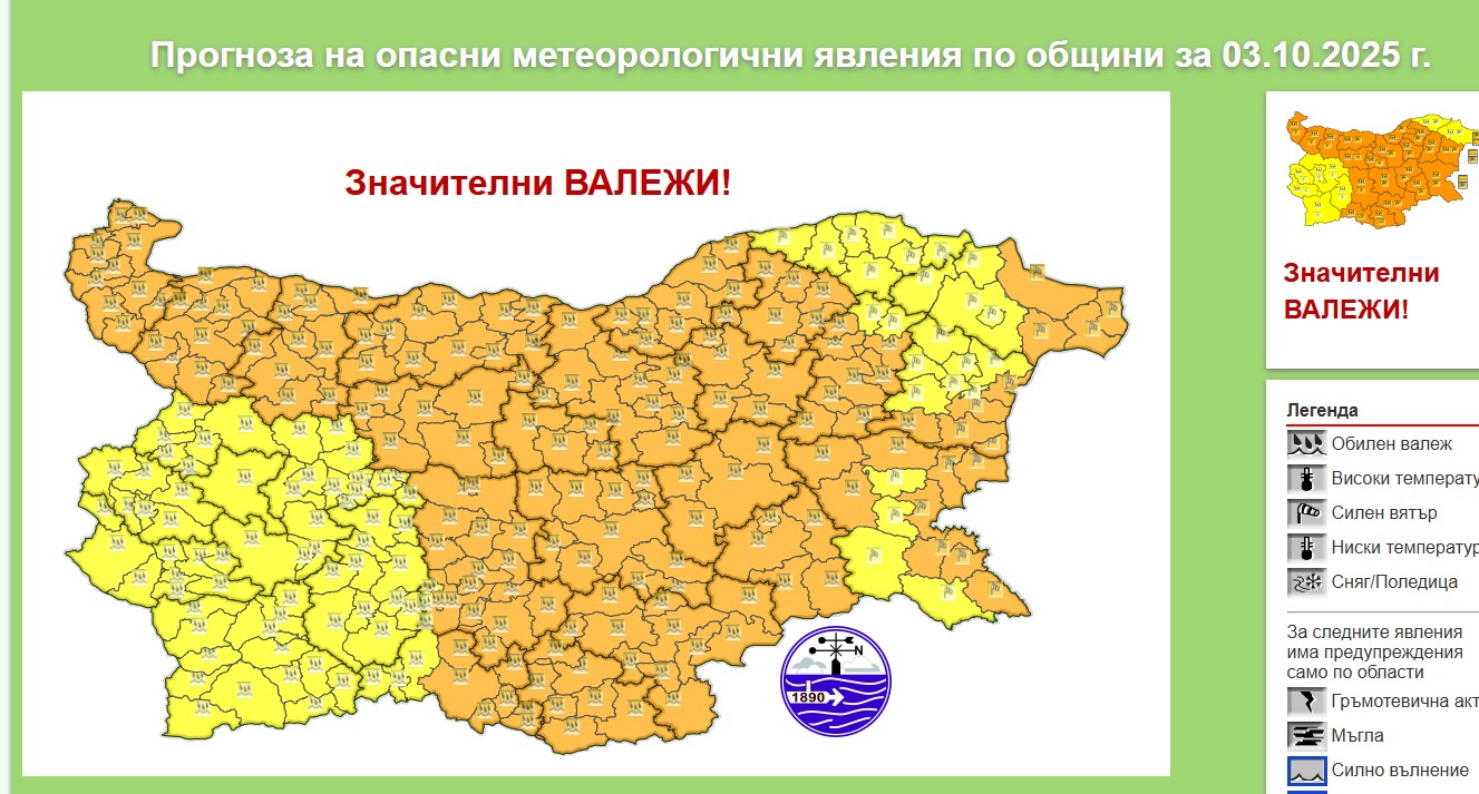НИМХ: Оранжев код за значителни валежи за Област Габрово Оранжев код за опасно време е издаден от НИМХ към БАН за цялата Област Габрово. Прогноза за: 03.10.2025 Продължаващи валежи от дъжд, в планинските райони над 600-800 метра преминаващи в сняг. Нови количества валеж – 35-40 mm, локално до 60 mm. По планинските проходи – навявания. [...]