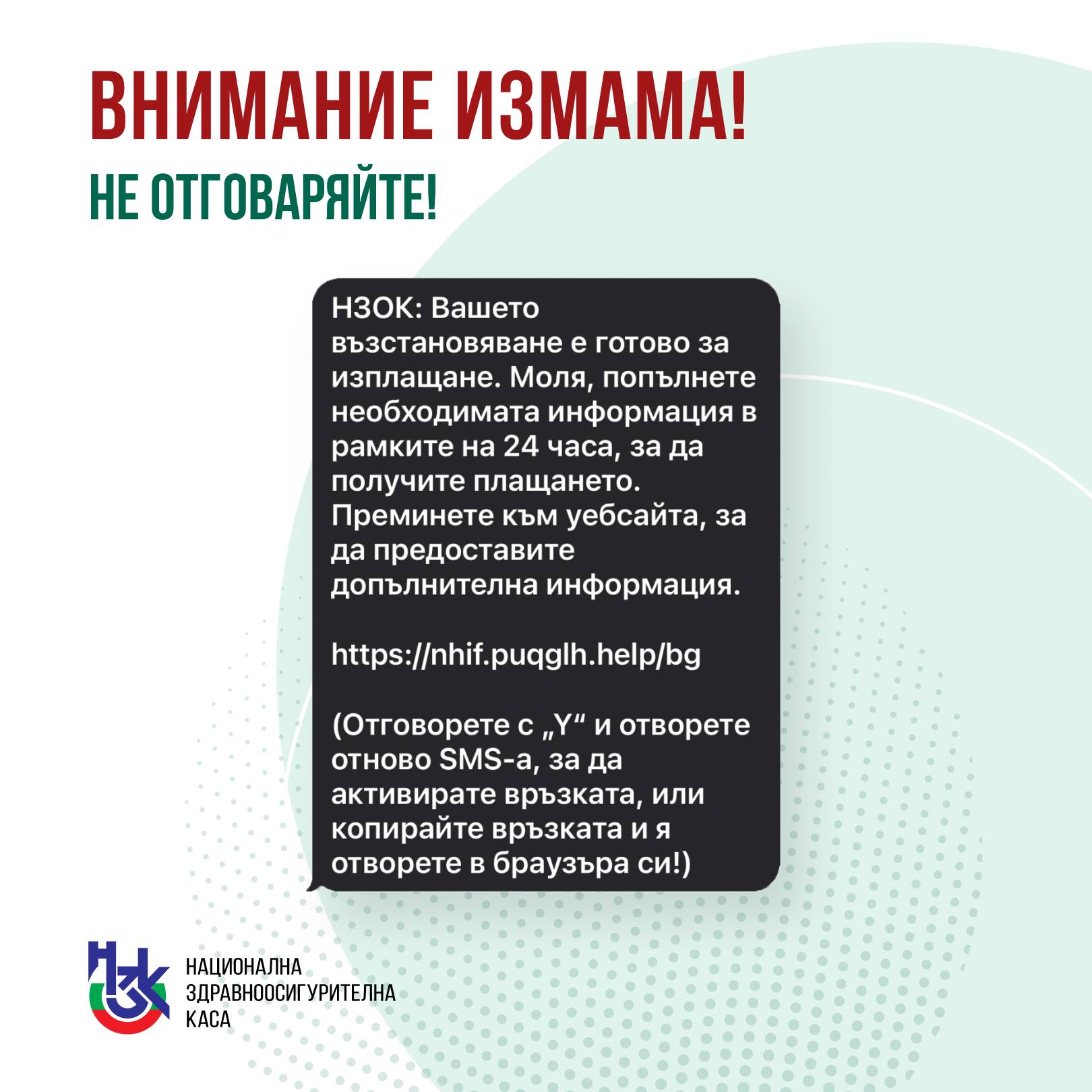 НЗОК: ПРОДЪЛЖАВАТ ОПИТИТЕ ЗА ИЗМАМА ОТ ИМЕТО НА НЗОК НЗОК предупреждават: В Националната здравноосигурителна каса (НЗОК) бяха получени множество сигнали от граждани за получаване на sms от името на институцията. Съобщенията „информират“ за готовност за възстановяване на средства. НЗОК предупреждава, че това са пиратски съобщения, обикновено изискващи конкретно действие на потребителя, при което се задейства [...]