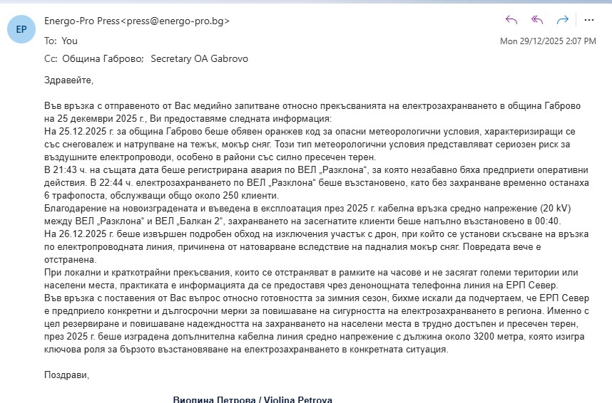 „Във връзка с отправеното от Вас медийно запитване относно прекъсванията на електрозахранването в община Габрово на 25 декември 2025 г., Ви предоставяме следната информация: