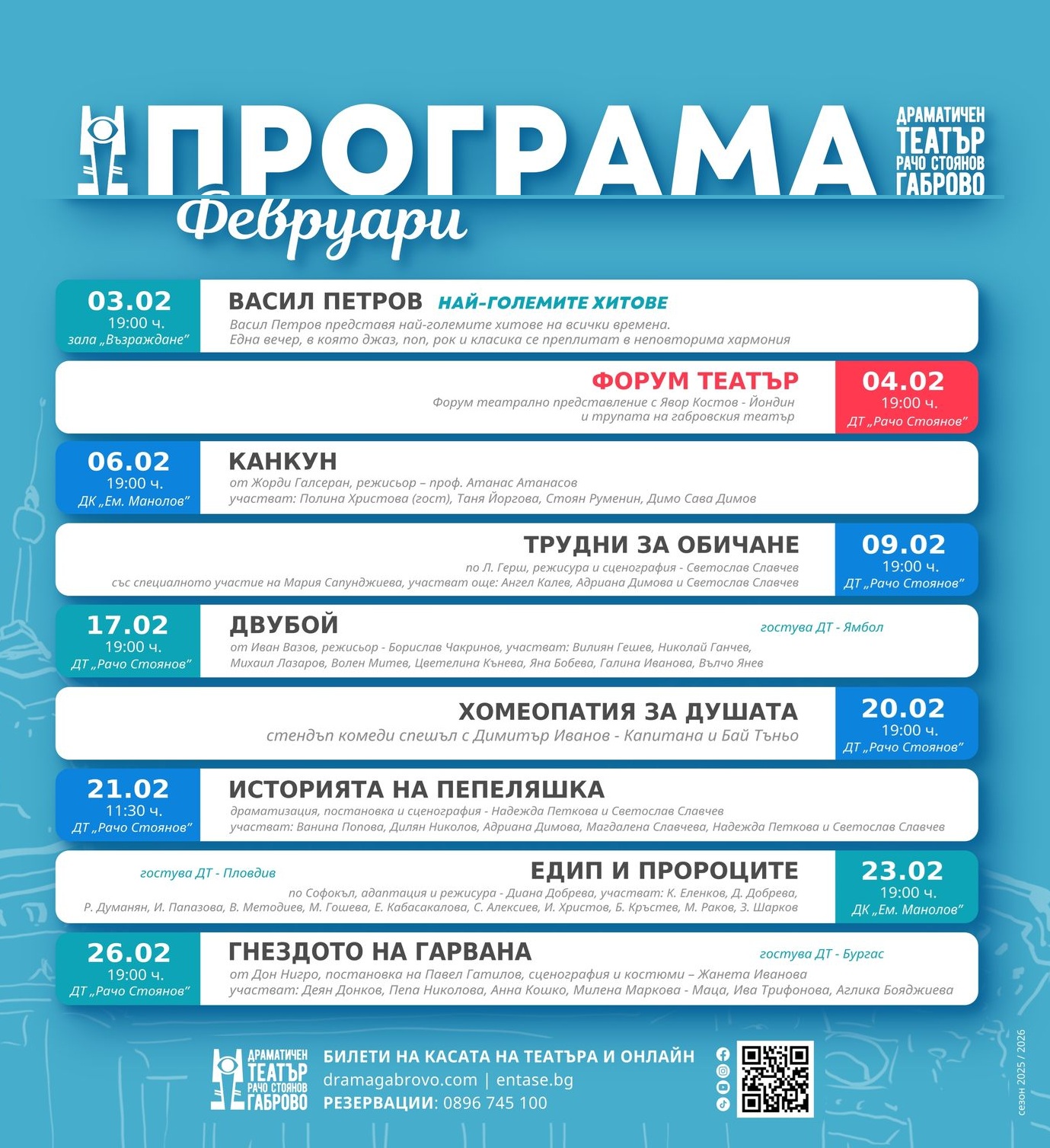 През месец февруари Драматичен театър „Рачо Стоянов“ – Габрово предлага на своята публика богата и разнообразна програма, включваща театрални спектакли, гостуващи представления и музикални събития. Репертоарът обхваща класически и съвременни заглавия, комедия, драма и сценични експерименти.