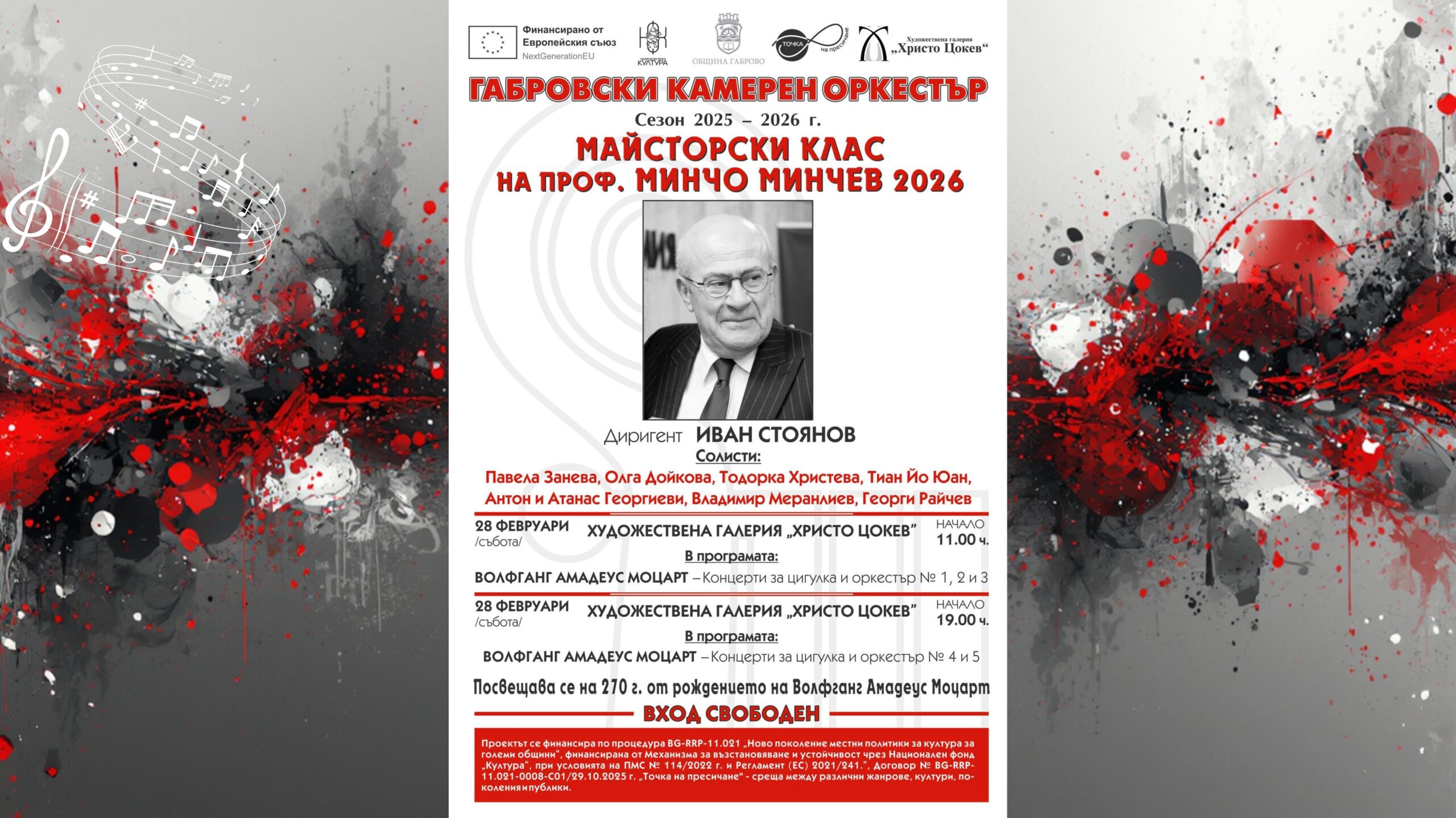 Габрово ще бъде домакин на едно от най-значимите музикални събития в културния календар на сезон 2025–2026 г. – Майсторски клас на проф. Минчо Минчев 2026, организиран от Габровския камерен оркестър. Събитието е посветено на 270-годишнината от рождението на Волфганг Амадеус Моцарт и ще предложи на публиката две изключителни концертни вечери с вход свободен.