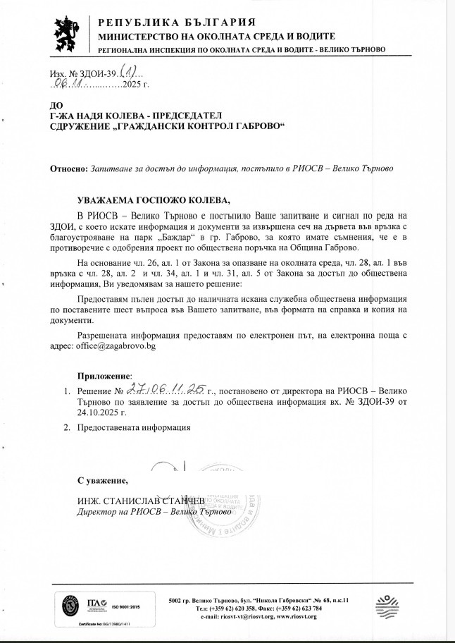 В отговор на сигнала от „Граждански контрол Габрово“, инспекцията потвърждава, че има издадено разрешение, но отново и в този отговор не се прилага карта с обозначените за отсичане дървета и/или тяхното посочване. Проверката на място е извършена на 23.10.2025 г. – това е и датата, на която бе подаден сигналът към МОСВ от „За Габрово“. И тази проверка, обаче, не открива нарушения, но времето, в което се е състояла сочи, че е извършена по-скоро в следствие на сигнала и на публичността на казуса, а не по някаква друга регулация.