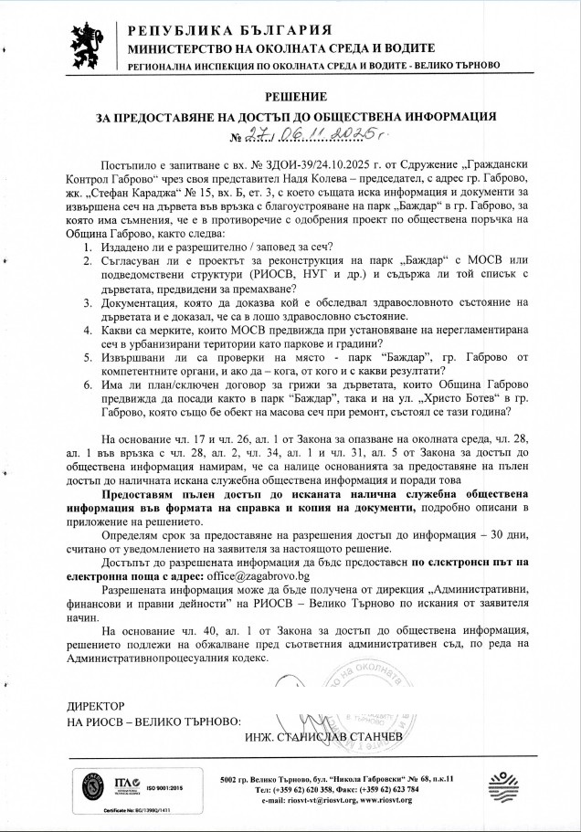 3. Решение на РИОСВ – Велико Търново (ЗДОИ-39-1)