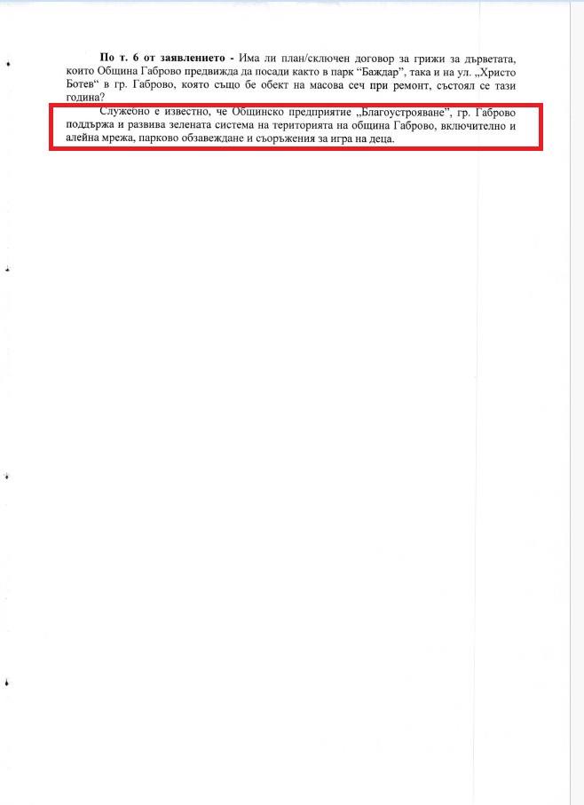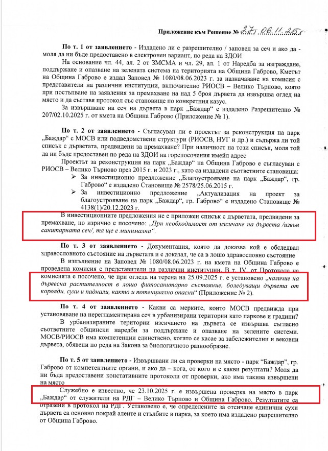 И трите документа са формално изрядни, но не съдържат най-важното – списък или карта на дърветата, които се премахват. В отговор на МОСВ също не се съдържа никакъв отговор по изпратения сигнал, а само към частта с конкретните въпроси, издадени по ЗДОИ. Това прави невъзможно общественото проследяване дали действително ще бъдат отсечени само 88 дървета и дали те наистина са били болни / с влошено фитосанитарно състояние.