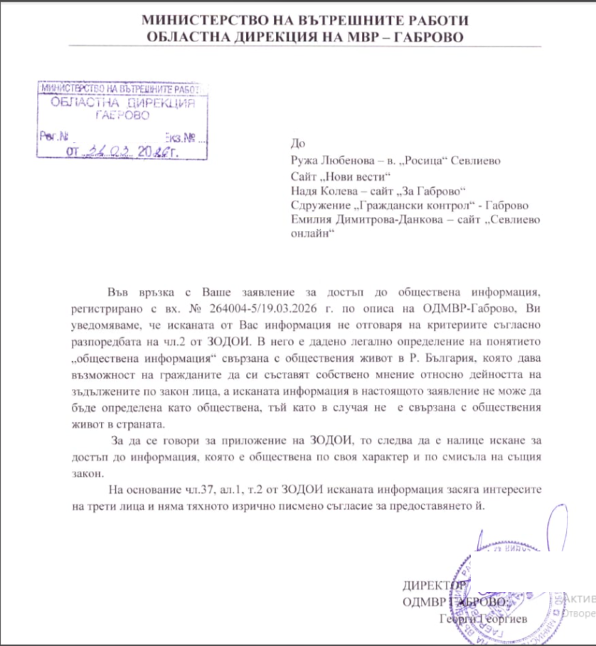Още по-категоричен е отказът от страна на Областната дирекция на МВР – Габрово. Според директора исканата информация изобщо не попада в обхвата на „обществена информация“ по смисъла на закона, тъй като не е свързана с обществения живот в степен, позволяваща на гражданите да си съставят мнение за дейността на институцията.