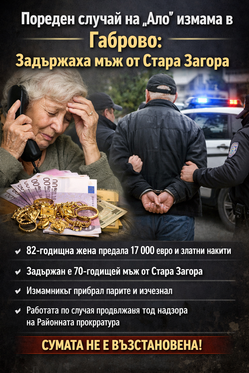 В Габрово е разкрит пореден случай на телефонна измама от типа „Ало“. Криминалисти са задържали 70-годишен мъж от Стара Загора, съпричастен към престъплението.