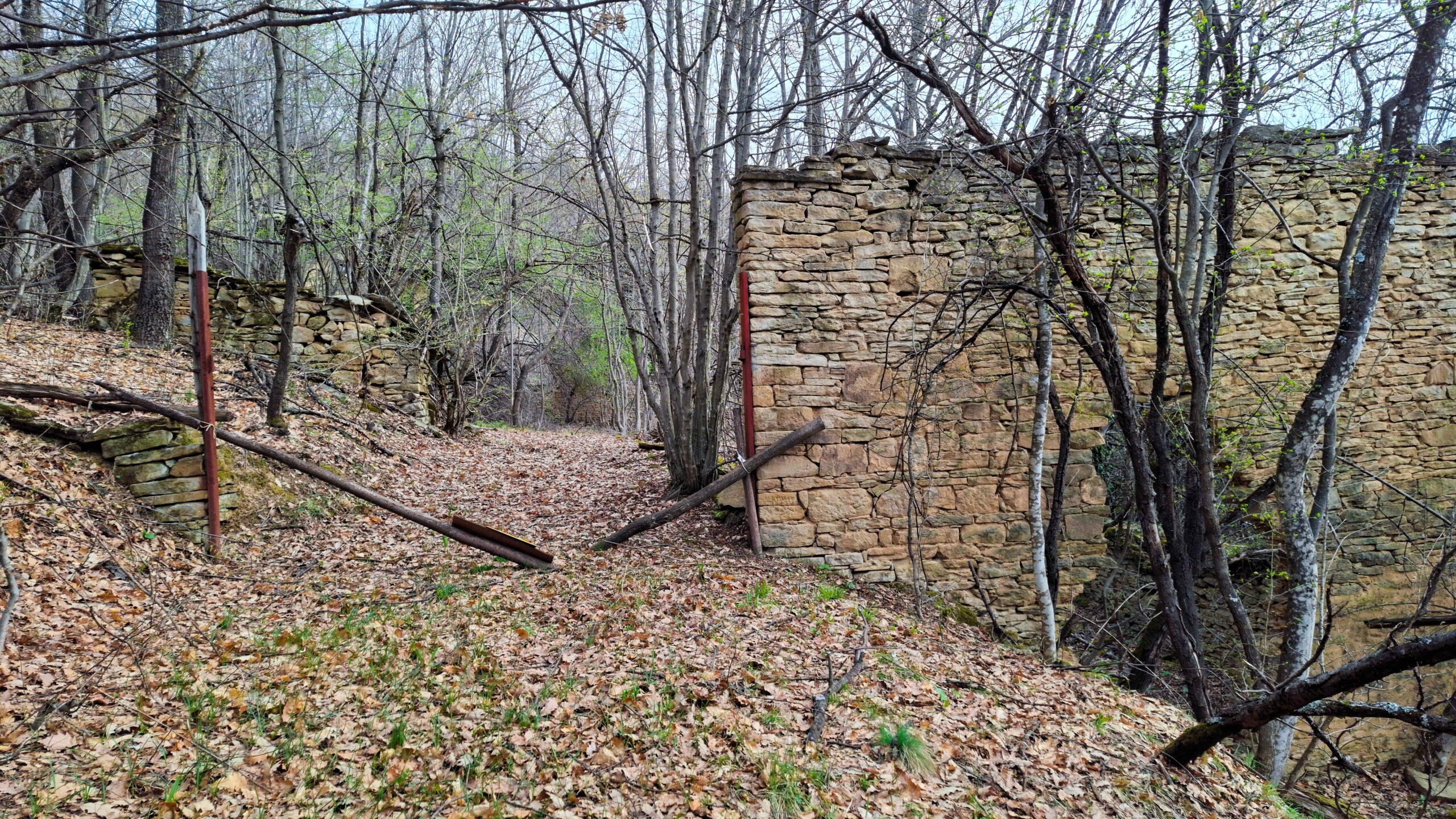 Гората става все по-усойна. Включвам телефона си към пауърбанка, защото множеството приложения, които използвам, изсмукват батерията му. На места сред дърветата се виждат порутени зидове, спускащи се по склона. Явно са служили за граница на имот. Но какъв имот на това място? Трудно е да се повярва, но дори на този баир хората са успявали да обработват земята и да изкарват прехраната си от нея.