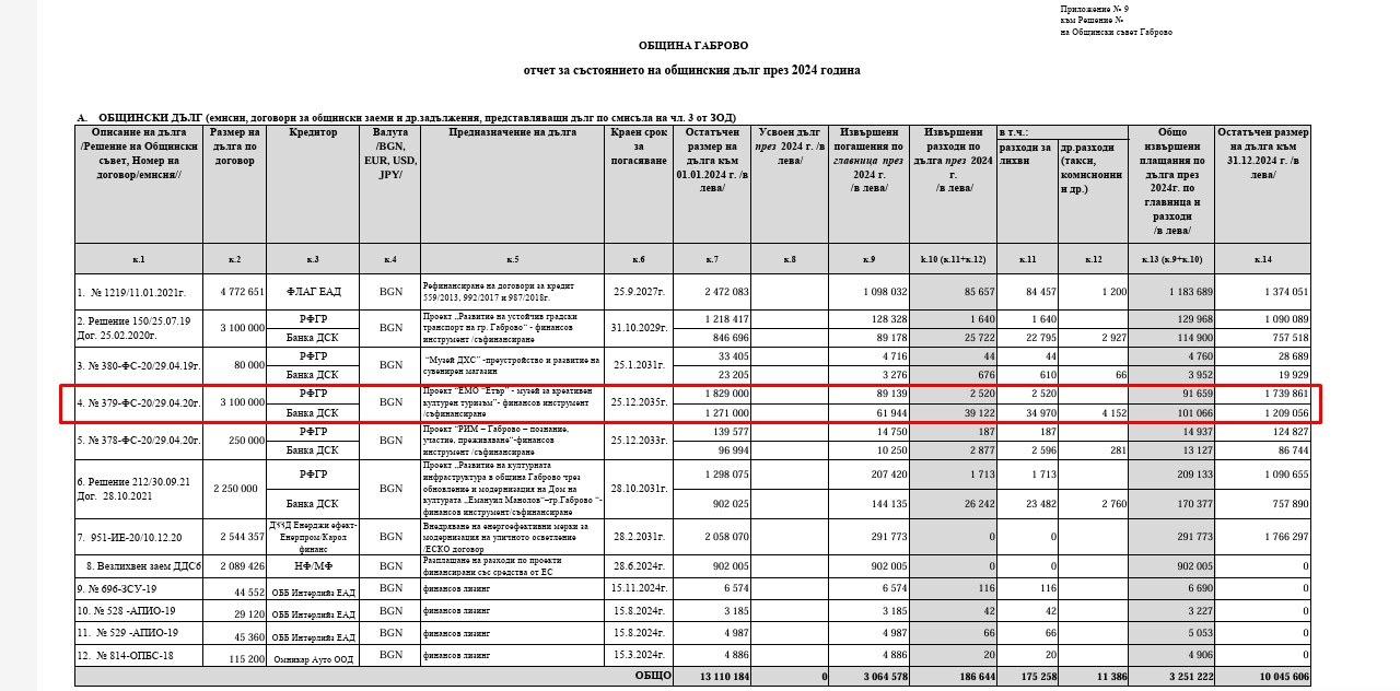 - Видно от приложената таблица, която е общественодостъпна информация от сайта на Община Габрово, заемът за ремонтите в РЕМО „ЕТЪР“ ще изплащат всички габровци, солидарно, до 2035 година!