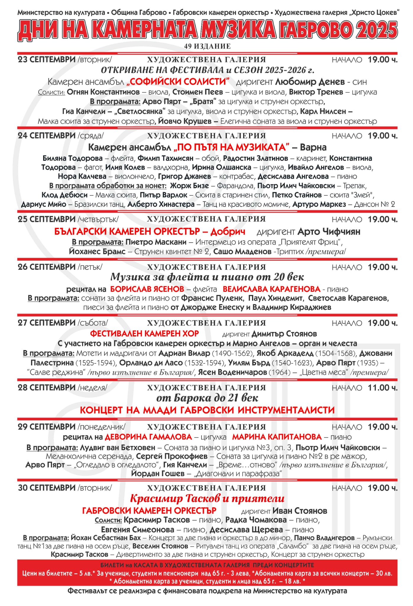 49-то издание на Дните на камерната музика Габрово 2025г. се реализира със субсидия от Министерство на културата и Община Габрово.