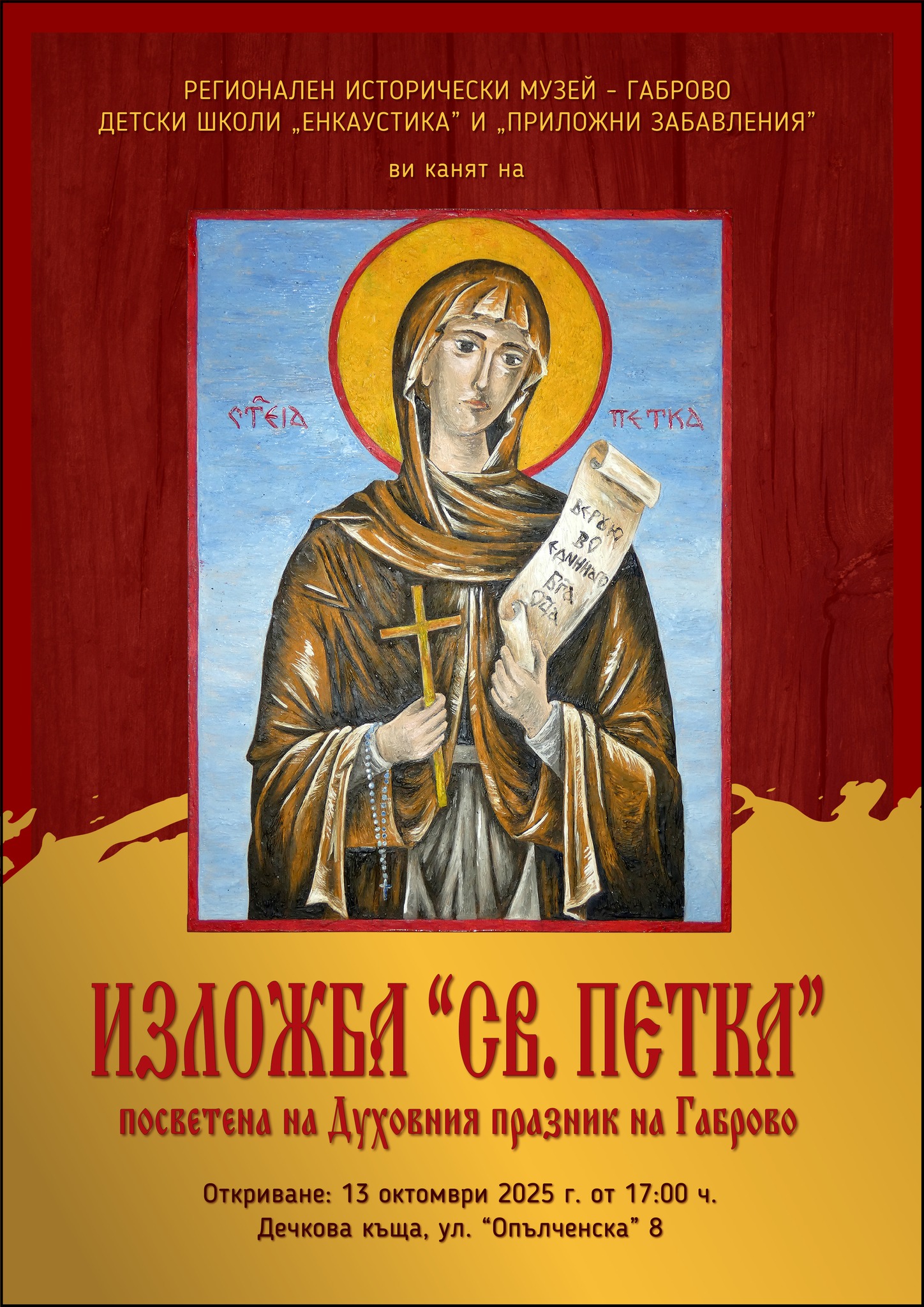 Изложба, посветена на Духовната покровителка на Габрово – Св. Петка, ще бъде открита в Дечкова къща Дечкова къща – Габрово ще бъдат домакини на изложба, посветена на Духовната покровителка на Габрово – Св. Петка. На 13 октомври, в навечерието на Духовния празник на Габрово, Регионален исторически музей – Габрово и детски школи „Енкаустика“ и „Приложни [...]