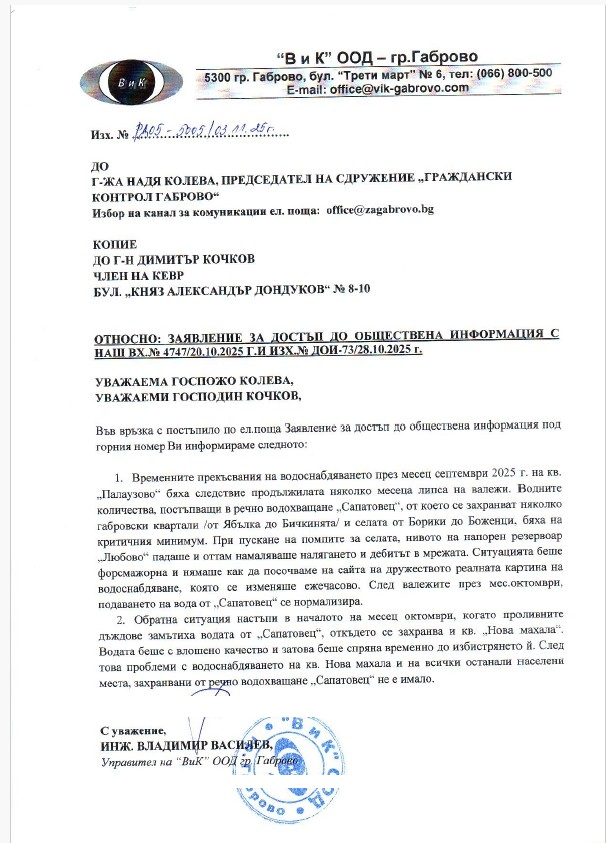 1. Временните прекъсвания на водоснабдяването през м. септември 2025 г. на кв. „Палаузово“ бяха следствие продължилата няколко месеца липса на валежи. Водните количества, постъпващи в речното водохващане „Сапатовец“, от което се захранват няколко габровски квартала / от Ябълка до Бичкинята/ и селата от Борики до Боженци, бяха на критичния минимум. При пускане на помпите за селата, нивото на напорен резервоар „Любово“ падаше и оттам намаляваше и налагянето и дебитът в мрежата. Ситуацията беше форсмажорна и нямаше как да посочваме на сайта на дружеството реалната картина на водоснабдяването, която се изменяше ежечасово. След валежите през м. октомври, подаването на вода от „Сапатовец“ се нормализира.