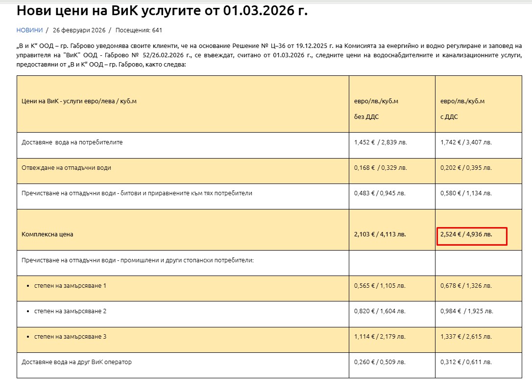 С оглед на настоящата ситуация, „ВиК“ ООД – Габрово въвежда  одобрените с решение № Ц-36 от 19.12.2025г. на КЕВР цени на ВиК услугите, считано от  01.03.2026 г.