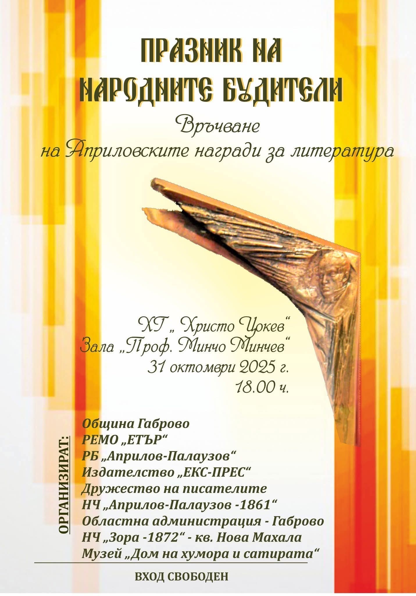 На 31 октомври от 18:00 часа в зала „Проф. Минчо Минчев“ в Художествена галерия „Христо Цокев“ ще бъдат връчени тазгодишните Априловски награди за литература.