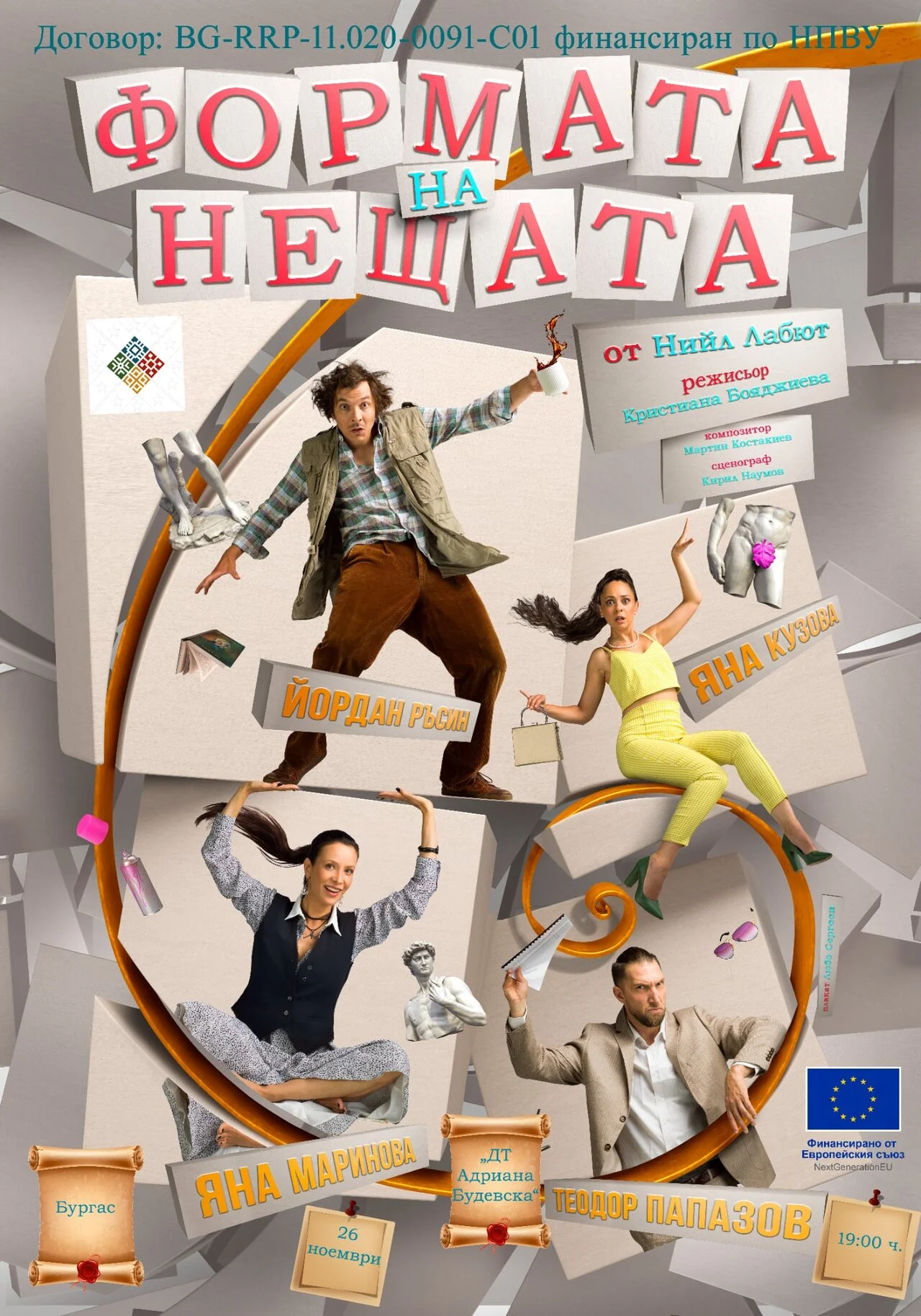 Яна Маринова: На 6-ти април в Габрово представяме спектакъла „Формата на нещата“ от Нийл Лабют. Романтична комедия, която през привидно леки и забавни случки, неусетно те подтиква да се замислиш колко далеч си готов да стигнеш, за да бъдеш приет сред успешните на деня.