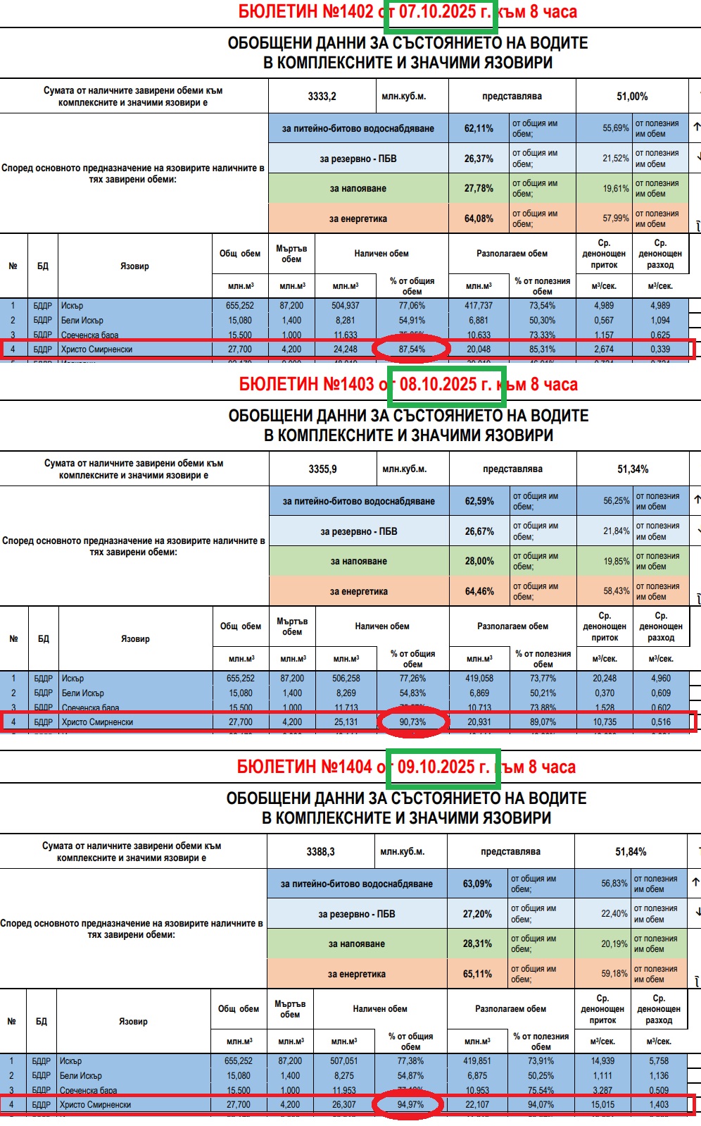 Спрямо предходните два дни, увеличението е с общо 2.059 млн. м³, или това са около 8% увеличение на обема за последните 2 дни (от 07 до 09 Октомври)