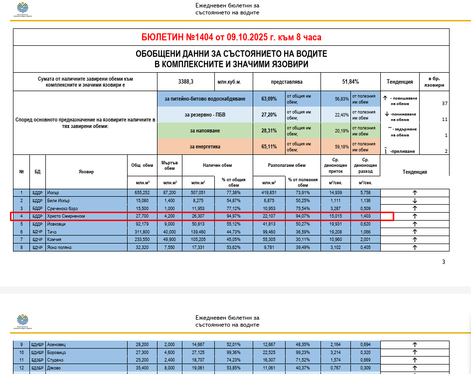 Към 8:00 часа на 09 октомври т. г. общият обем на язовир Христо Смирненски достигна до 26.307 млн. м³, което представлява 94.97 % от общия наличен обем на язовира.