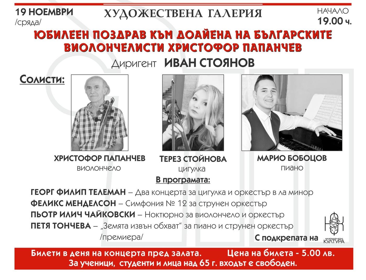 На 19 ноември (сряда) от 19:00 ч. в Художествената галерия ще се състои тържествен юбилеен концерт на Габровски камерен оркестър с диригент Иван Стоянов. Концертът е посветен на един от най-значимите български музиканти – виолончелистa Христофор Папанчев. Събитието представлява специален поздрав към творческия му път и приноса му към българското музикално изкуство.
