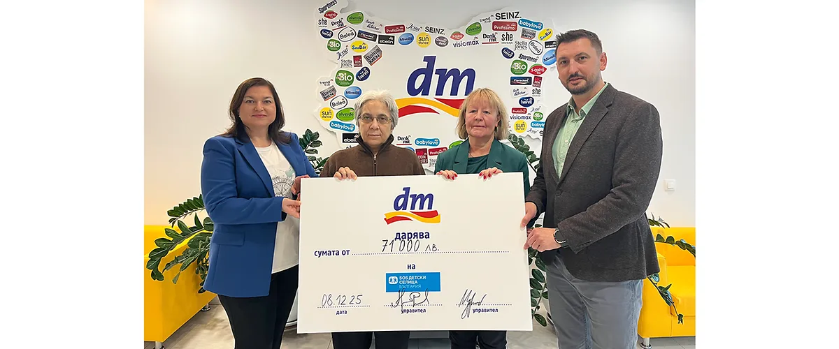 На 28.11.2025 г. Ви призовахме да се присъедините към мисията ни, а ние се ангажирахме да дарим 5% от дневния оборот на всички физически dm магазини, както и от поръчките, направени онлайн и през Моят dm-App. В резултат даряваме 71 000 лв.* на SOS Детски селища България в помощ на Звено „Майка и бебе” в Габрово. Звеното оказва подкрепа на млади майки и бременни жени, изправени пред риск да изоставят децата си.