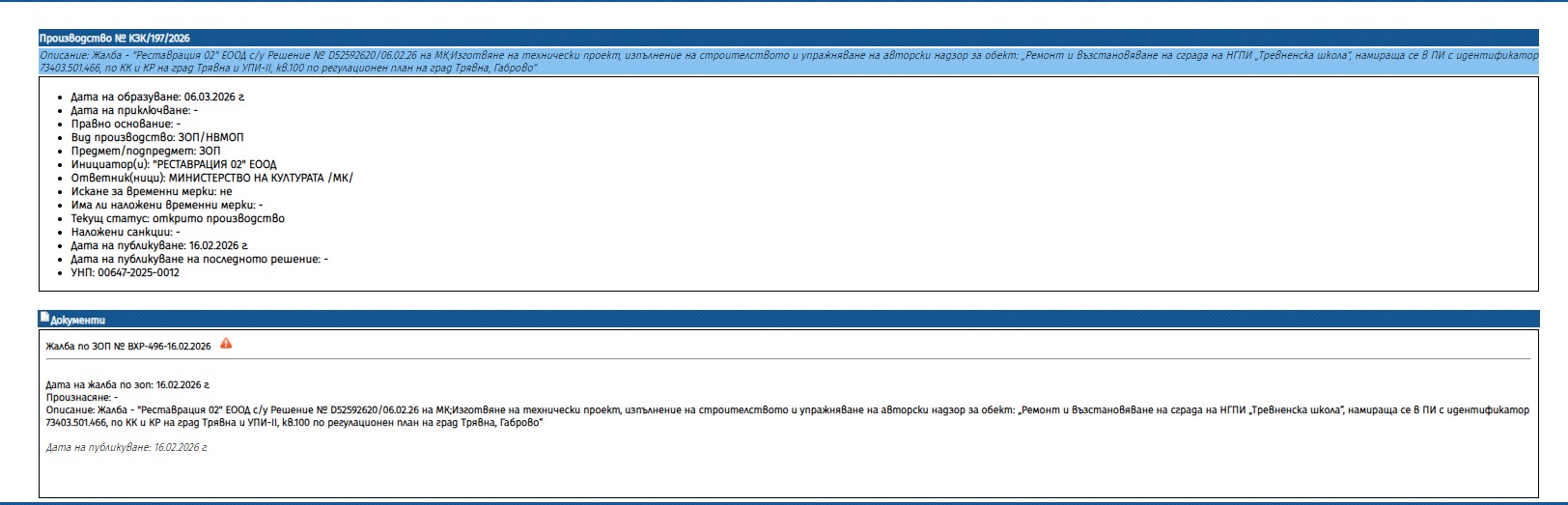 Процедурата по обществената поръчка за „Ремонт и възстановяване на сградата на НГПИ „Тревненска школа“ ще бъде временно забавена след постъпила жалба по реда на Закона за обществените поръчки. Жалбата е заведена от „Реставрация 02“ ЕООД с входящ № ВХР-496-16.02.2026 г., което води до спиране на развитието на процедурата до произнасяне на компетентния орган.