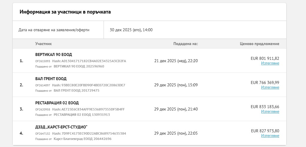 На първо място е класирано ДЗЗД „КАРСТ-ЕРСТ-СТУДИО“, с оферта с входящ № OF2647132/29.12.2025 г., подадена от „Карст Благоевград“ ЕООД (ЕИК 206442696). Предложената цена за изпълнение на поръчката е 827 973,80 евро без ДДС.