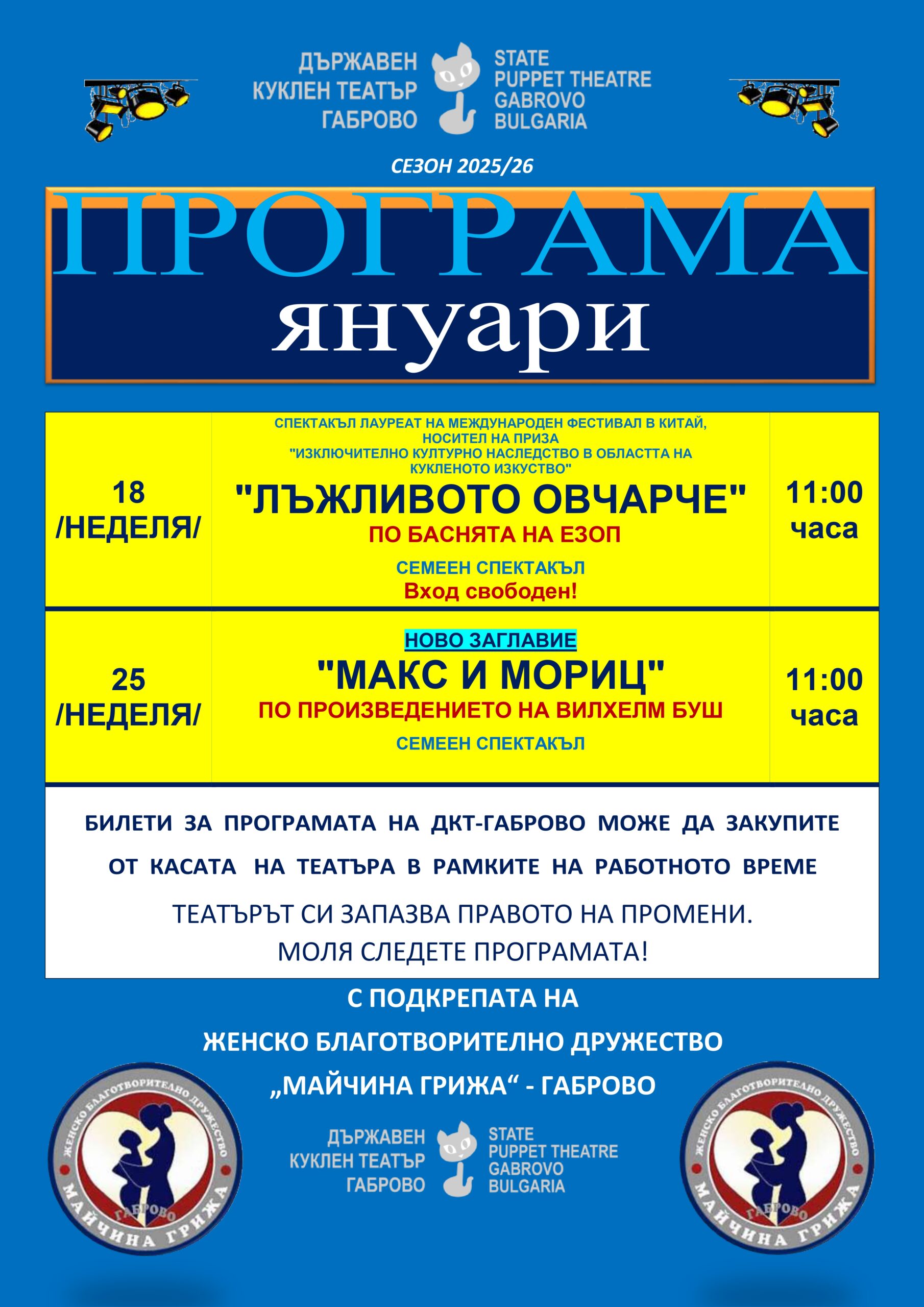 Безвъзмездният жест на ЖБД „Майчина грижа“, насочен именно към най-малките любители на кукленото изкуство и техните близки има за цел в началото на годината да предостави искрица добро настроение със спектакъл лауреат на международен фестивал в Китай, носител на приза „Изключено културно наследство в областта на кукленото изкуство“, част от репертоара на ДКТ-Габрово. В съдружие, ръка за ръка – двете организации дават възможност не само за досег до изкуството на Мелпомена, но и да се изживее истинска семейна неделя на 18 януари /неделя/ от 11:00 ч., когато ще е първият спектакъл на кукленият театър за годината вдигащ завесата за честванията по повод 55 години Държавен куклен театър – Габрово и 70 години куклено изкуство в град Габрово.