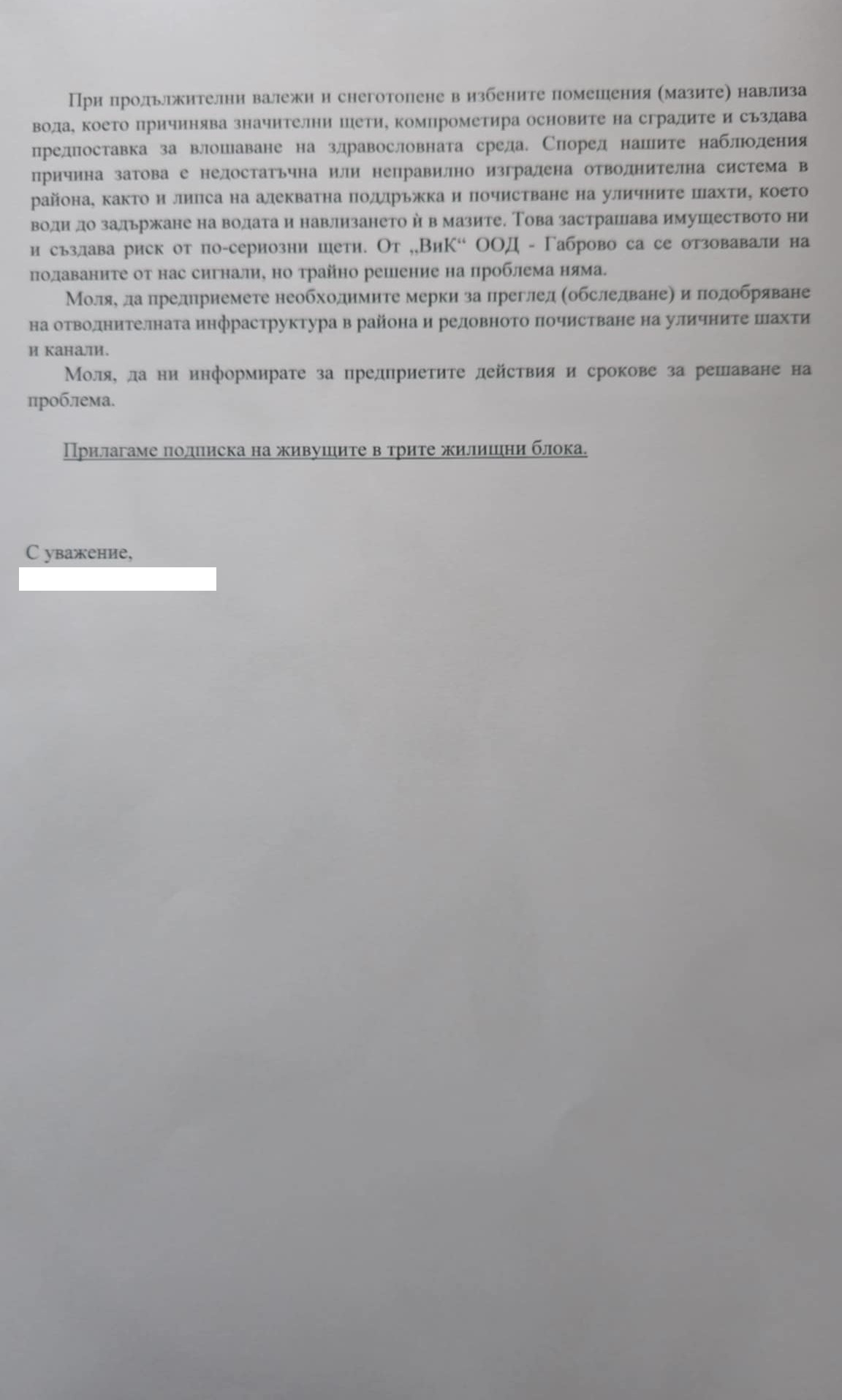 Подписката от ул. „Свищовска“ №63, 65 и 67 е поредният сигнал, че проблемът с водата в този район на Габрово е системен и изисква спешно, професионално и дългосрочно решение – преди следващите проливни дъждове отново да превърнат мазетата в басейни…