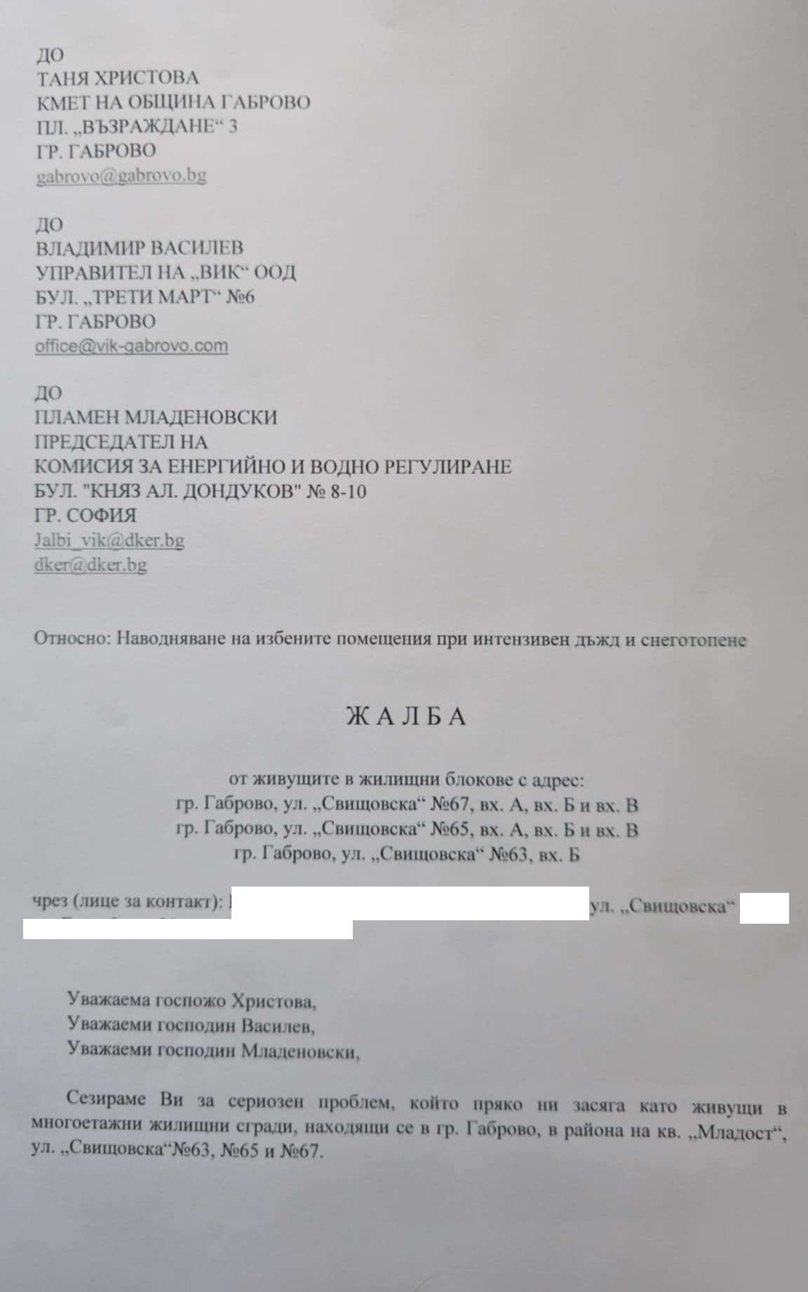 Близо 100 жители на няколко жилищни блока на ул. „Свищовска“ в Габрово сигнализират за сериозен и дългогодишен проблем с наводняване на избени помещения при обилни валежи и снеготопене. С подписка и официален сигнал, адресиран до кмета на Община Габрово, управителя на ВиК – Габрово и председателя на КЕВР, хората настояват за спешни и трайни мерки.