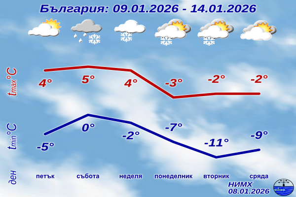 През нощта срещу петък облачността ще намалее и в петък ще преобладава слънчево време. След обяд от запад облачността отново ще започне да се увеличава, а привечер и през нощта срещу събота на места в Западна България ще има и валежи от сняг. Вятърът ще отслабне, ще се ориентира от юг. Студено време с минимални температури между минус 8° и минус 3°, максимални – между 1° и 6°. През почивните дни ще бъде облачно с валежи. В събота в югоизточните райони и Горнотракийската низина – от дъжд, в останалата част от страната – от сняг, а в неделя навсякъде ще са от сняг. В събота вятърът ще остане от юг и температурите за кратко ще се повишат, минималните ще бъдат около нулата, а максималните ще са от 1°-2° в северозападните до 10°-11° в югоизточните райони. По-късно през деня и през нощта срещу неделя вятърът ще се ориентира от северозапад и временно ще се усили; в неделя температурите ще са с малък денонощен ход, в по-голямата част от страната между минус 5° и 0°, в крайните източни райони до 3°-4°. В началото на новата седмица ще бъде много студено, със значителна облачност, на отделни места със слаби превалявания от сняг. В понеделник минималните температури ще са до минус 9° минус 10°, а във вторник ще се понижат още, дневните в цялата страна ще са отрицателни. В сряда вероятността за валежи вече ще е малка, вятърът ще се ориентира от югоизток и дневните температури в южните райони ще се повишат.