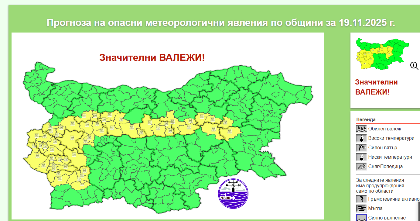 Жълт код за валежи за Област Габрово за сряда, 19 ноември